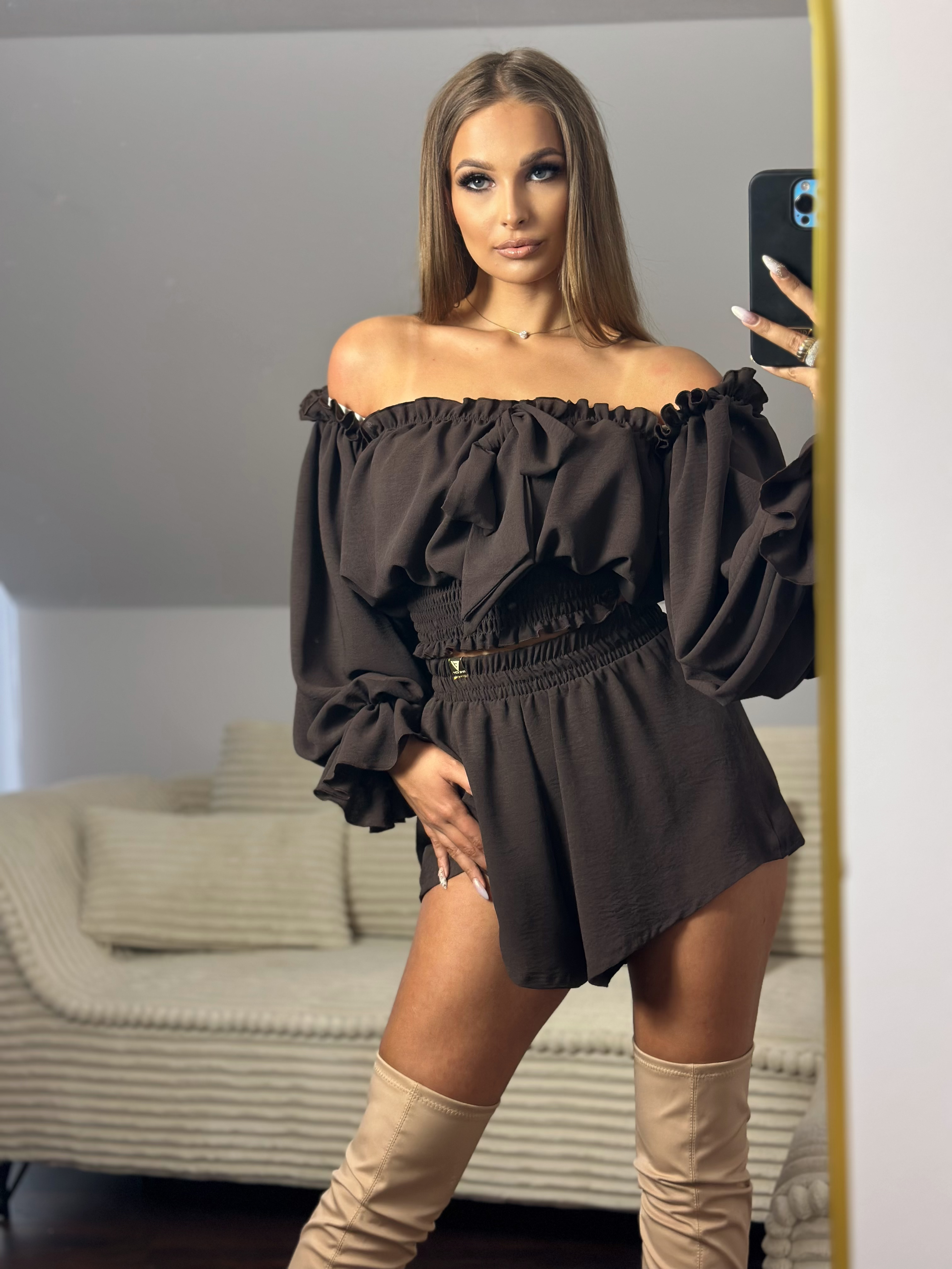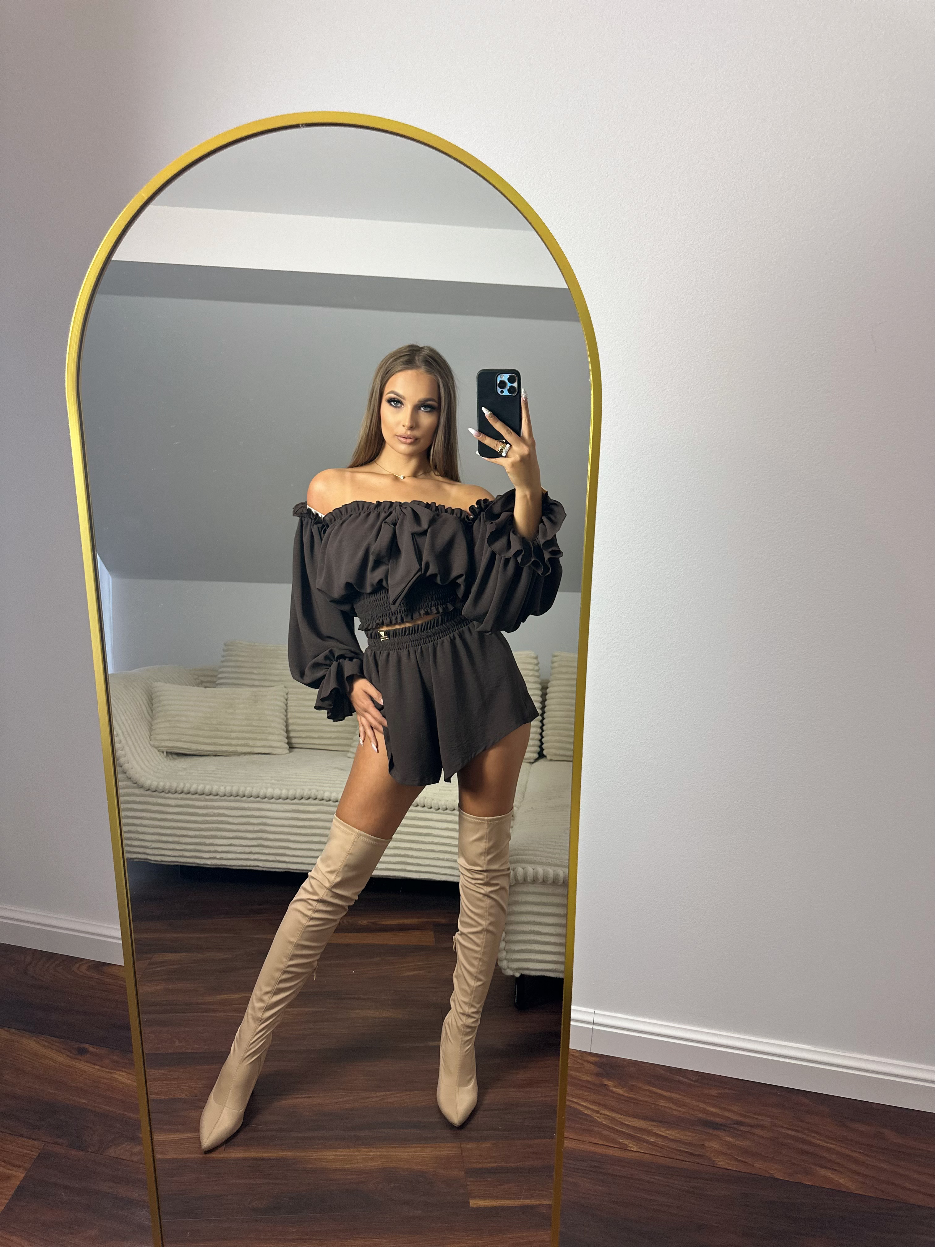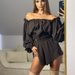 Lekki, kobiecy komplet składający się z krótkich spodenek i bluzki typu hiszpanka.